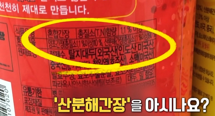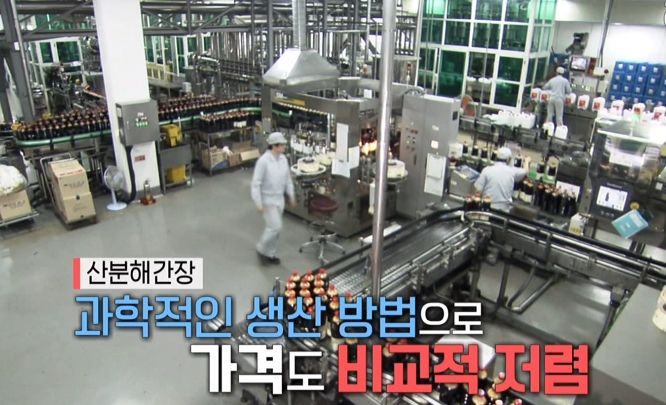 오랜 시간 발효시킨 전통 간장과 달리 산분해간장은 식용 염산을 넣어서 콩 단백질을 아미노산으로 빠른 시간에 분해해 만드는데요. 더 빨리, 더 많은 양의 아미노산을 얻어낼 수 있어서 가격도 저렴하고 감칠맛도 좋다고 합니다.