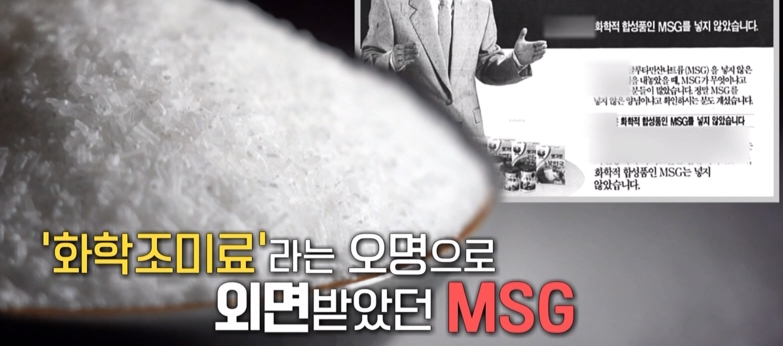 "MSG는 향미증진제입니다. 이것을 만드는 과정 중에 나트륨을 붙이다 보니까 화학 공정에 의해 이뤄진다고 해서 화학조미료라고 불리게 됐고요, 때문에 많은 사람들이 화학조미료에 대한 불신, 기피하는 현상이 있었죠. 그런데 2010년도에 이미 식품의약품안전처에서 평생 먹어도 안전하다고 선언하고 인정한 것이 향미증진제입니다."