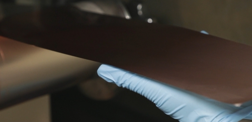 다음 구리판 위에 접착 롤러를 붙여 만들어진 그래핀을 플라스틱 기판으로 옮기고. 다시 두 개의 기판을 겹쳐 터치스크린을 만들게 됩니다. 그래핀 산업화의 중요한 기점이 될 획기적인 연구였습니다.