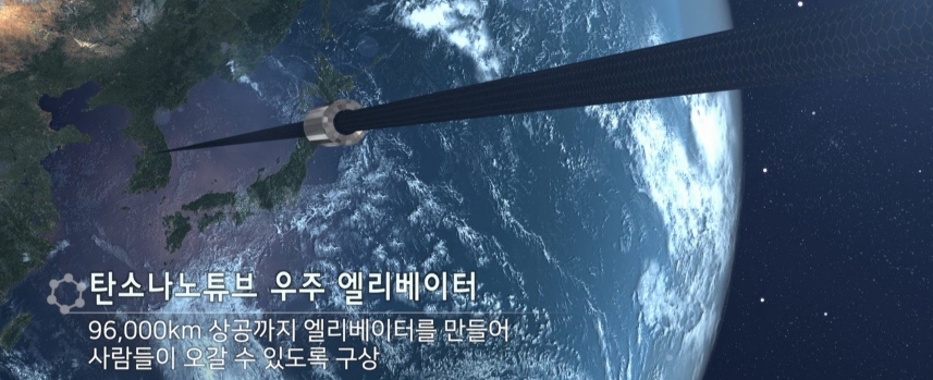 우주 엘리베이터가 현실화되면 우주의 혹독한 환경을 견딜 수 있는 엄청난 강도의 케이블이 필요합니다. 적어도 강철의 100배는 돼야 한다는 거죠. 그 후보로 거론되는 게 바로 탄소나노튜브. 그야말로 무한한 가능성의 신소재입니다.