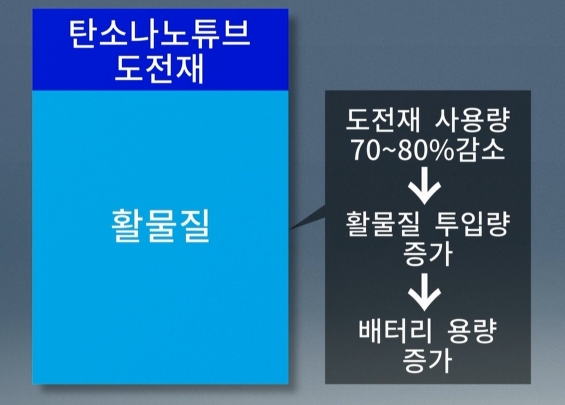 탄소나노튜브는 기존 카본블랙보다 훨씬 적은 양이 들어가 활물질의 투입량이 어느 늘어납니다. 그러니까 전자의 이동이 빨라지는 만큼 충전 속도는 빨라지고 수명은 길어지게 됩니다.