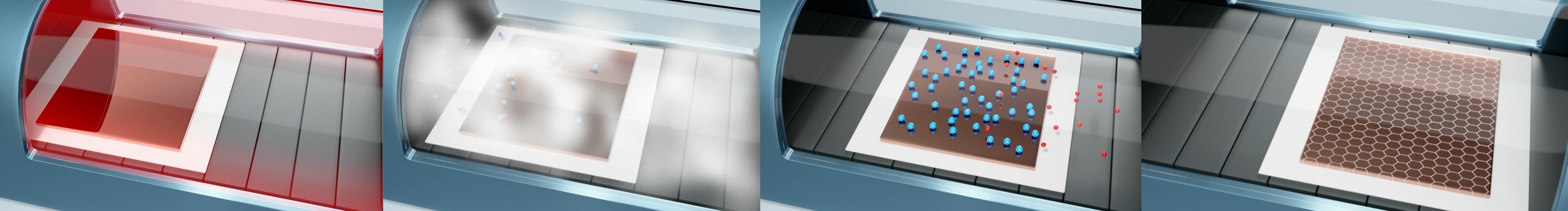 관건은 그만한 크기의 그래핀을 어떻게 박막 위에서 만들어내는가. 여기에는 화학적 기상증착법이라는 기술이 사용됐습니다. CVD라는 이 기술은 원료 가스를 분해시켜 화학적인 방법으로 얇은 두께의 박막을 만드는 것을 말합니다. 그렇다면 이 화학적 기상증착법을 통해 어떻게 그래핀을 만들었는지 한번 알아볼까요?