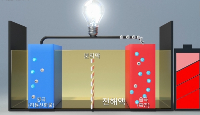 통상 전기자동차에는 2차 전지인 리튬이온 배터리를 사용하는데요. 양극과 음극 사이를 전자들이 오가며 충전과 방전이 이루어집니다. 전자가 양극에서 음극으로 이동하면 충전, 반대로 가면 방전이 됩니다.