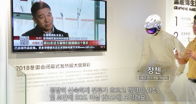 이 회사는 그래핀을 이용해 특수 기능성 의류를 만들고 있는데요. 당시 중국 정부의 의뢰를 받아 자체적으로 열을 내는 발열 공연복을 만들어냈습니다.