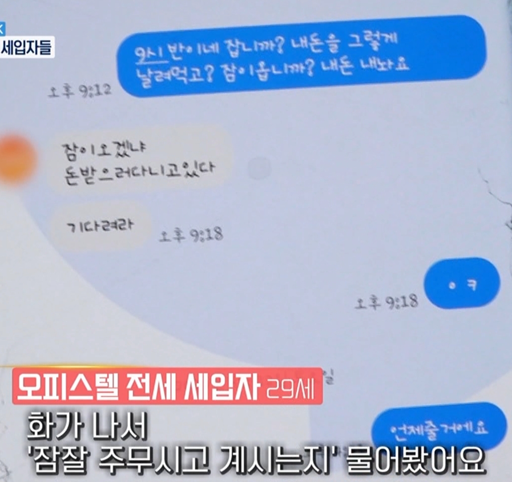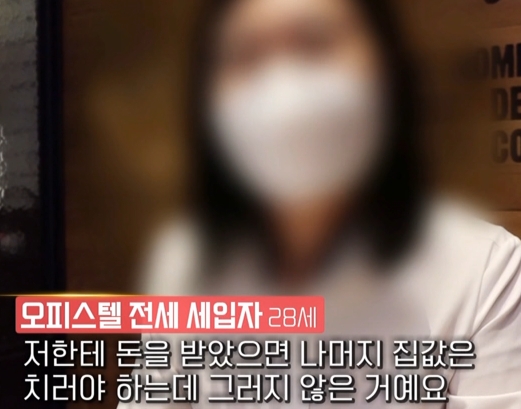 오피스텔 전세 세입자 27세 : 이렇게 맨날 보증금을 주겠다고 하면서 매일 와서 돈 없다고, (사업이) 잘 안 된다고 그런데 돈 받을 곳은 있다고 얘기를 하고 가요.