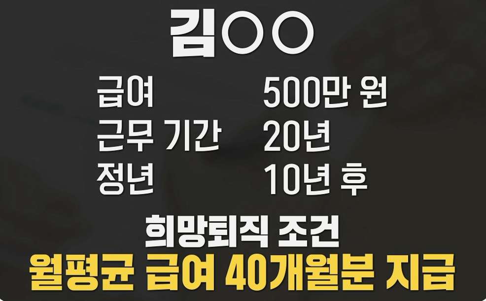 두 번째, 당장에 비용이 증가하더라도 중장기적인 관점에서는 이득이기 때문입니다. 예를 들어보겠습니다. ㅇㅇ은행에 근무하는 김 씨가 있습니다. 희망퇴직 조건은 40개월 치 월 평균 급여 지급이고 김 씨의 월 평균 급여는 500만 원. 정년까지는 10년이 남았습니다.