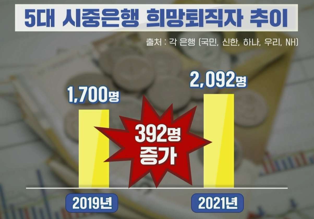 최근 은행사, 카드사 등 금융업계를 중심으로 희망퇴직 건수가 늘어나고 있죠. 5대 시중 은행의 희망퇴직자 수는 2년 전과 비교해 약 400명이 증가했습니다.