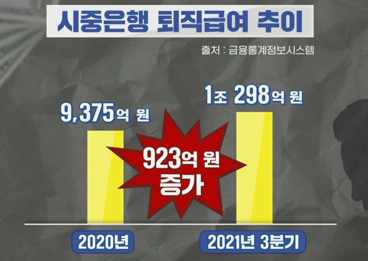 올해는 1월 23일 기준 희망퇴직자가 1,300명 이상으로 집계됐습니다. 지난해의 절반을 넘어선 건데요. 그러다 보니 시중은행 퇴직급여 총액은 지난해 3분기 기준 1조 원을 넘기며 역대 최고치를 기록했습니다.