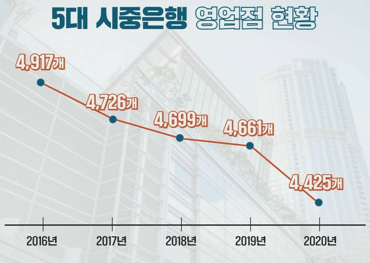 그런데 이렇게 큰돈을 지급하면서까지 기업에서 희망퇴직을 권하는 이유가 뭘까요? 첫 번째, 인원 감축이 필요하기 때문입니다. 인원 감축의 이유는 영업점 감소. 매년 줄어들다 보니 2020년에는 약 4,400개만 남았다고요.
