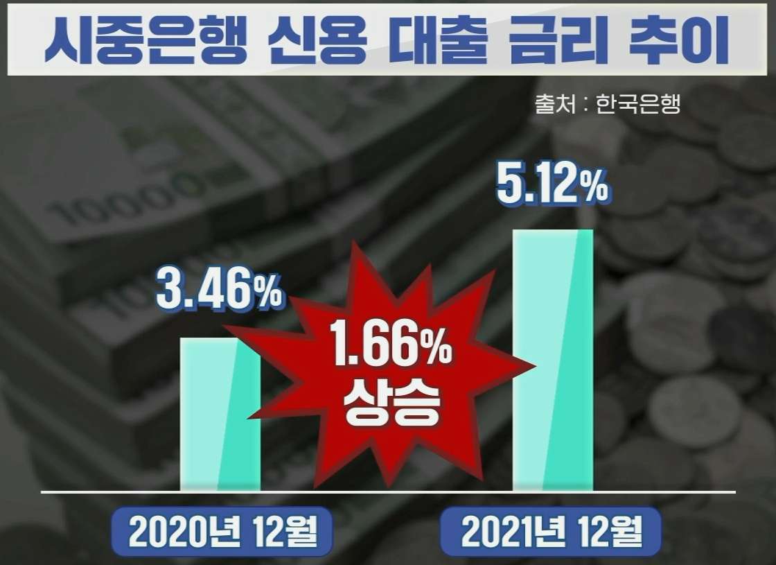 지난해 12월 기준 시중은행 신규 대출 금리는 3.66%로 1년 사이에 0.83%포인트 올랐습니다. 신용대출 금리는 무려 5.12%로 전년 대비 1.66%포인트나 올랐습니다.