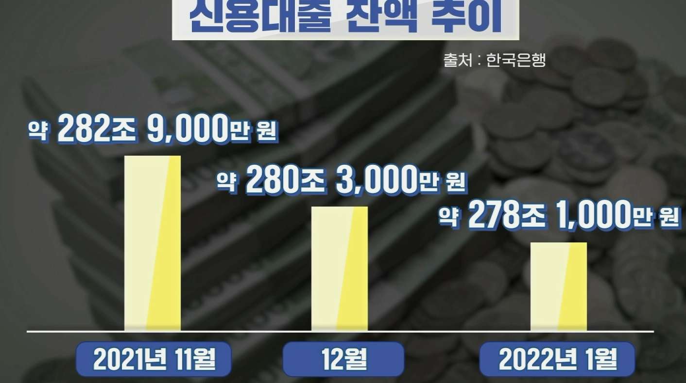 시중은행의 신용대출 등 대출 잔액은 2021년 11월 약 282조 9천만 원에서 2022년 1월 278조 1천만 원으로 두 달 연속 감소했습니다.