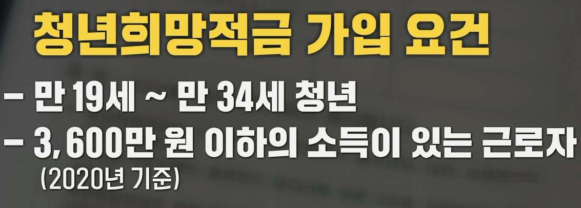 해당 적금의 가입 요건은 만 19세에서 34세 청년 중 2020년에 3,600만 원 이하의 소득이 있는 근로자입니다.