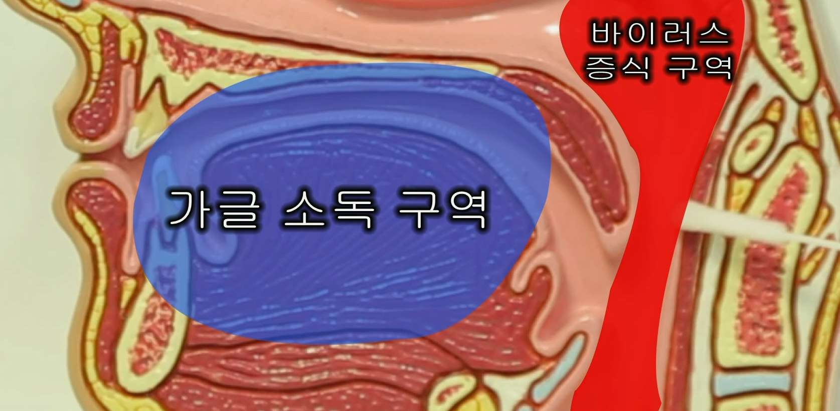 아래 그림에서 확인할 수 있듯이, 가글을 아무리 오래 열심히 하더라도 식도와 후두에 붙어 있는 깔대기 부분, 인두까지는 닿을 수 없기 때문이죠.