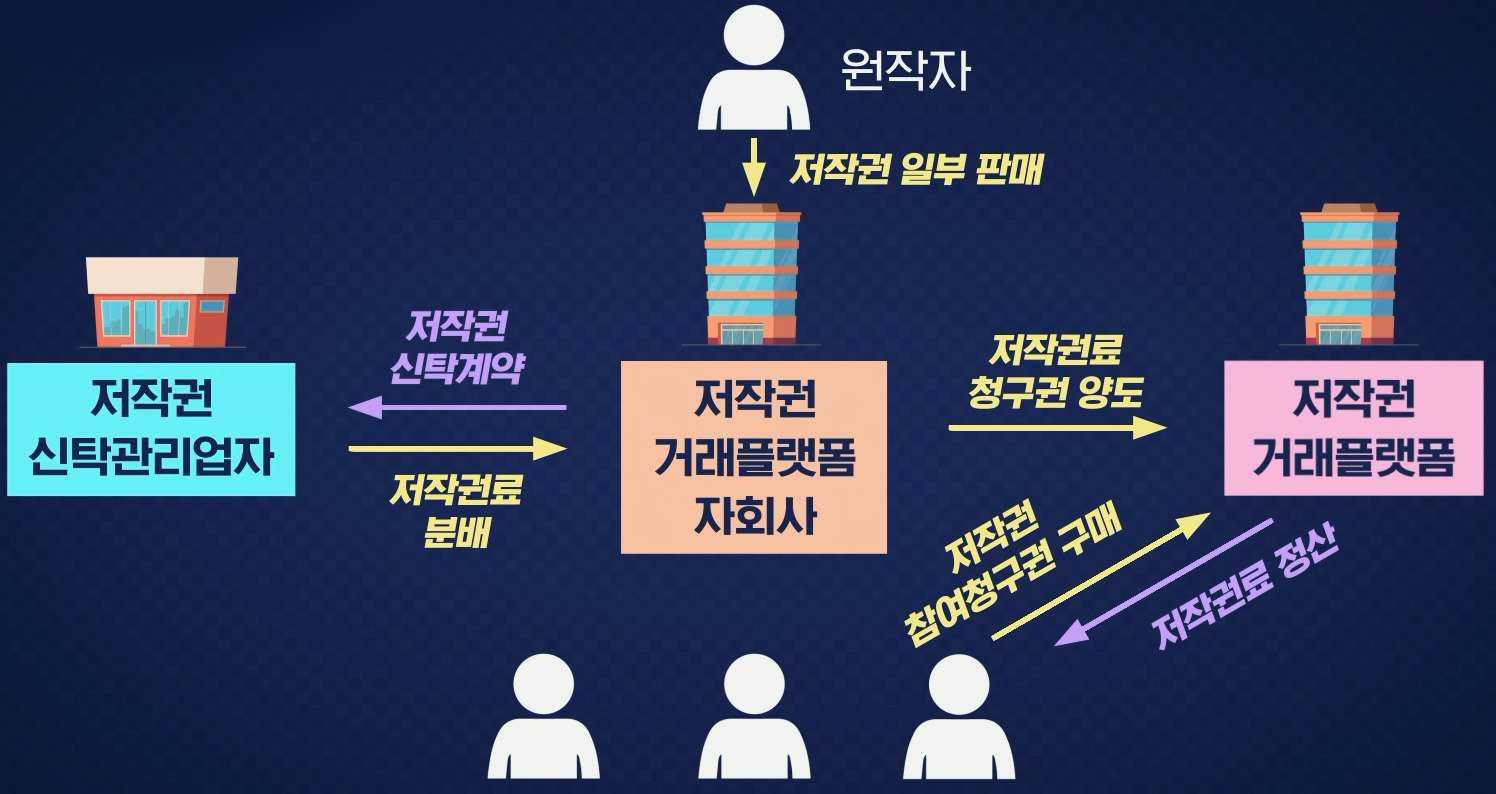 최근 뜨거운 감자로 떠오른 회사가 있습니다. 음악저작권을 거래하는 플랫폼 회사 뮤직카우 인데요. 매입한 저작권을 거래도 하고 소유하기도 하는 건데 원작자에게 저작권을 구매한 뒤에 플랫폼을 통해서 저작권료를 받을 수 있는 권리인 일명 저작전 참여 청구권을 1주 단위로 쪼개서 판매하는 방식으로 운용되고 있었습니다.