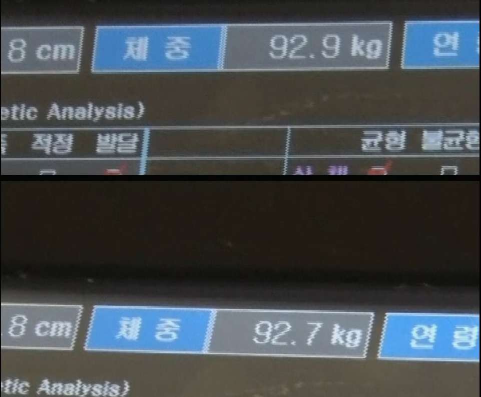 먼저 운동 전의 몸상태를 확인한 후 이틀에 걸쳐 실험을 진행했는데요. 하루는 땀복을 착용하고 또 하루는 땀복을 착용하지 않고 똑같은 운동을 진행했습니다. 땀복을 입는 것만으로 과연 운동 효과가 달라질까요? 실험 결과를 공개하겠습니다. 땀복을 입지 않은 상태에서 운동했을 때 체중의 변화입니다. 아래를 보면 0.2kg이 줄었네요.