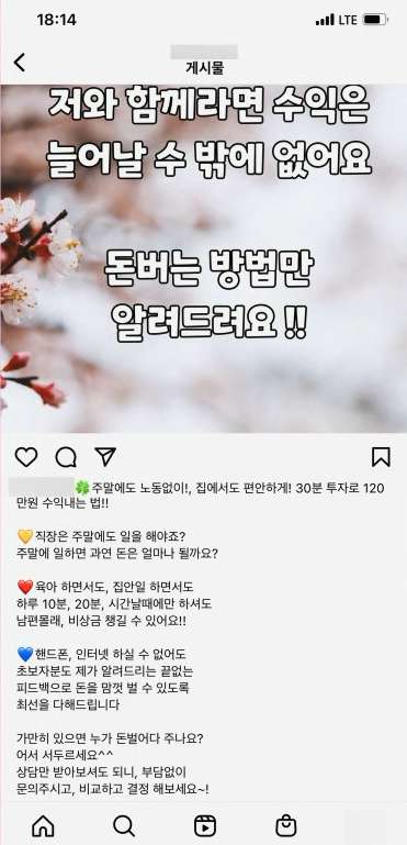 예전에는 생활 정보지나 신문 광고를 통해서 부업을 알선하고 신청비 명목으로 돈을 가로채는 사기가 많았는데요. 요즘에는 SNS로 옮겨와서 게시물이나 다이렉트 메시지 등으로 홍보하는 수법으로 사기를 치고 있습니다. 그런데 다들 SNS 많이 하는데 어떤 식으로 하는 걸까요?