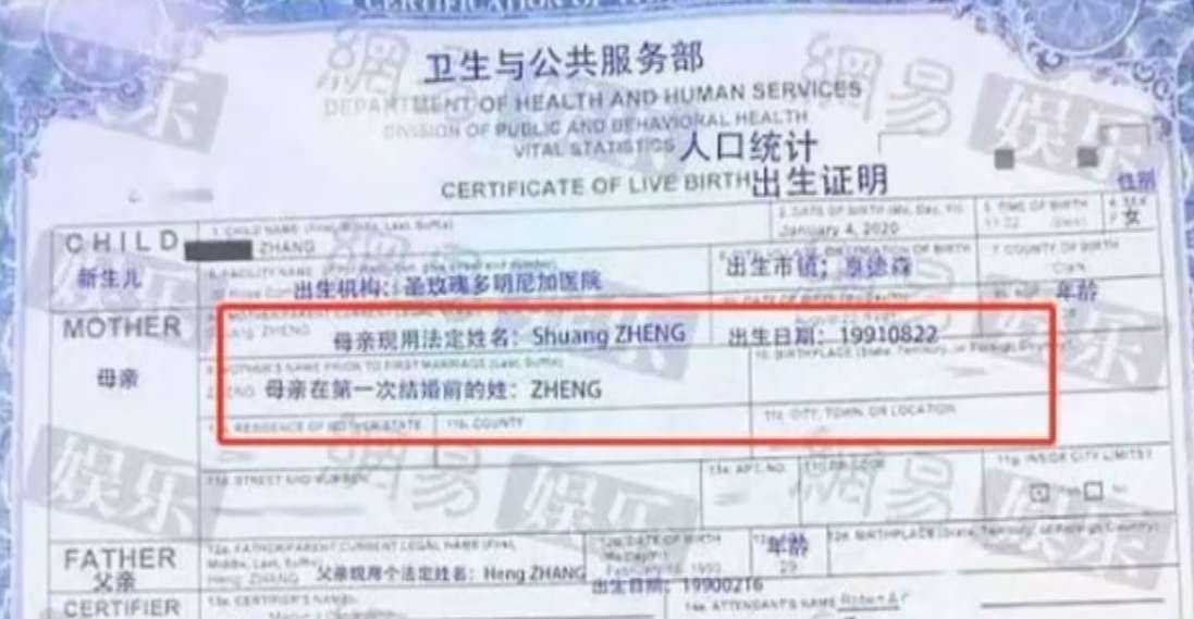 이 글과 함께 공개한 출생증명서에 두 아이의 엄마로 정솽이 기재되어 있었던 것.