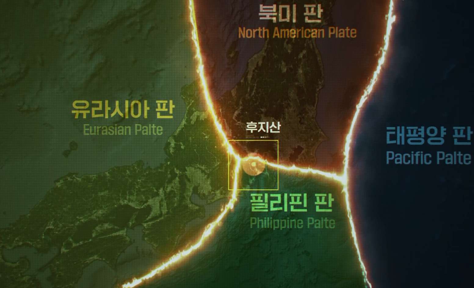 일본열도는 유라시아판, 북미판, 필리핀판, 태평양판, 이렇게 4개의 판이 공존하고 있고 후지산은 이 중 3개의 판이 겹쳐지는 부분에 위치하고 있습니다.