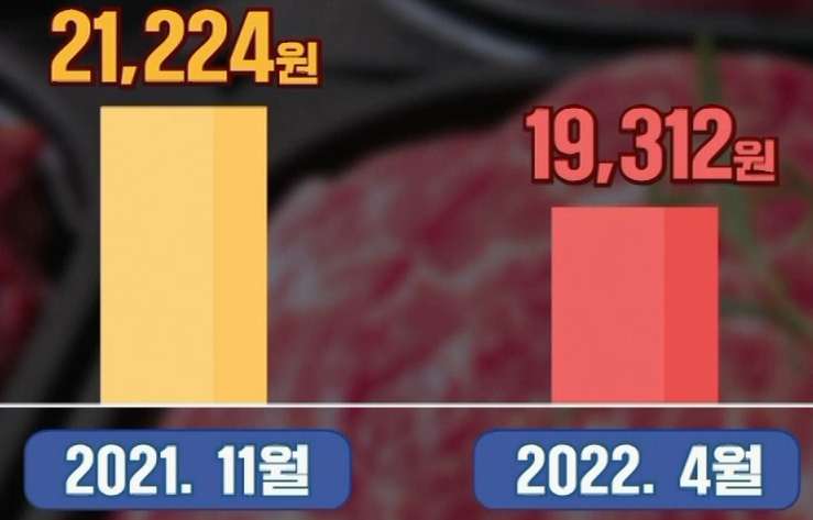 그런데 삼겹살마저 금겹살이 된 요즘 나홀로 가격이 하락한 것이 있습니다. 비싼 음식의 대명사로 통하는 한우. 지난 4월 한우 1kg당 평균 도매가격은 6개월 전에 비해 9%나 내린 것입니다. 2021년 11월은 21224원, 2022년 4월은 19312원입니다.
