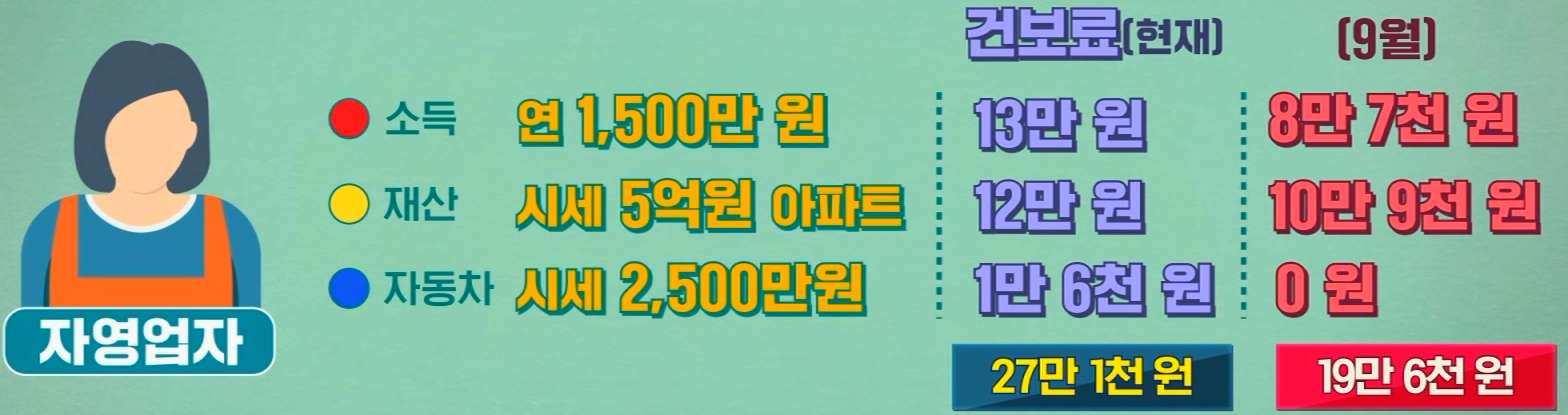 예를 들어보겠습니다. 연소득 1,500만 원인 자영업자 A 씨를 예로 들어봅시다. 시세 5억 원 아파트에 살며 2,500만 원 차량을 가진 경우 지금까지 매월 27만 1천 원의 보험료를 냈지만 9월부터는 약 19만 6천 원만 내면 됩니다. 총 7만 8천 원이 줄어들게 되는 거죠.