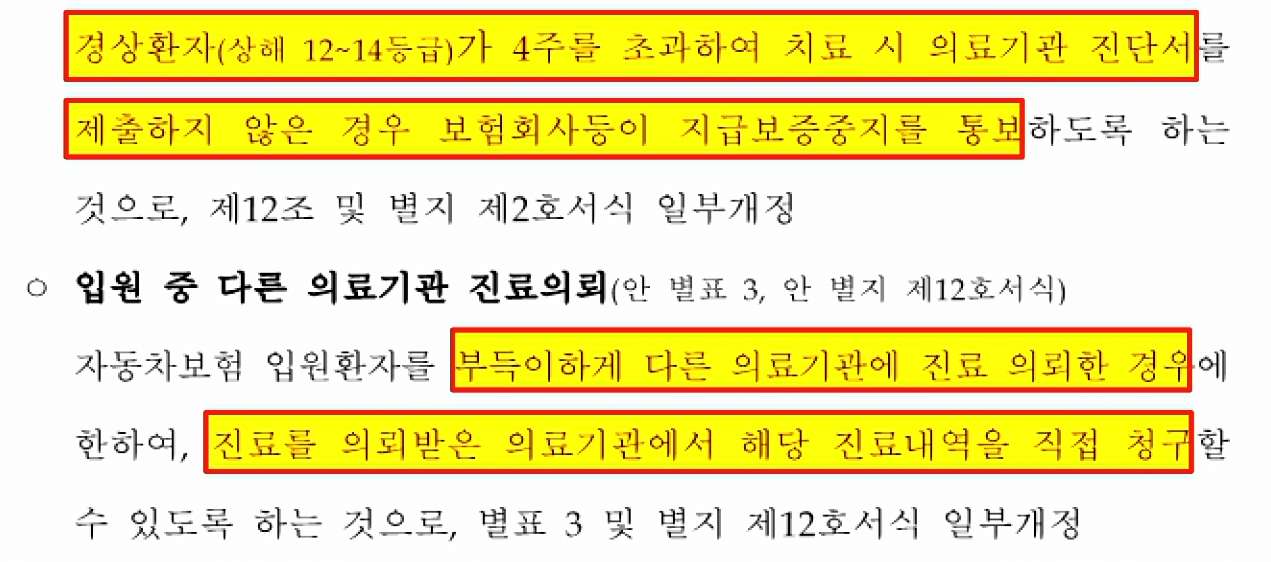 그리고 지난 7월 15일 교통사고 경상 환자를 대상으로 개정안이 고시됐죠. 진단서를 제출하지 않으면 4주의 기간 이후 치료에 대한 보험금을 못받을 수 있다는 내용인데요.