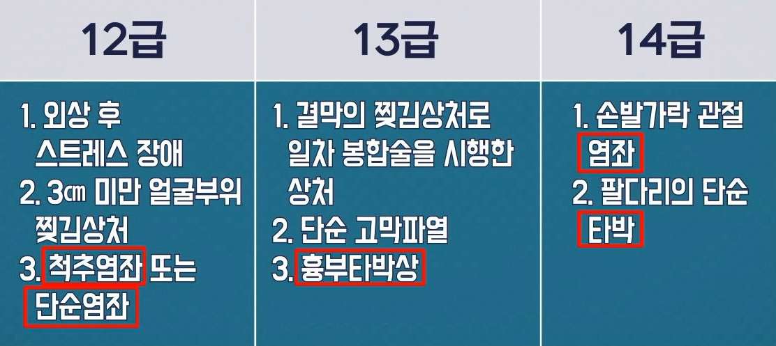 4주의 제한은 상해 등급과 관련이 있는데요. 1부터 14급까지 있는 상해 등급표. 그중 12, 13, 14등급은 염좌, 타박상 등 경상에 해당하는 상해. 여기에 속하는 경상 환자가 바로 4주의 제한을 받는다고요.