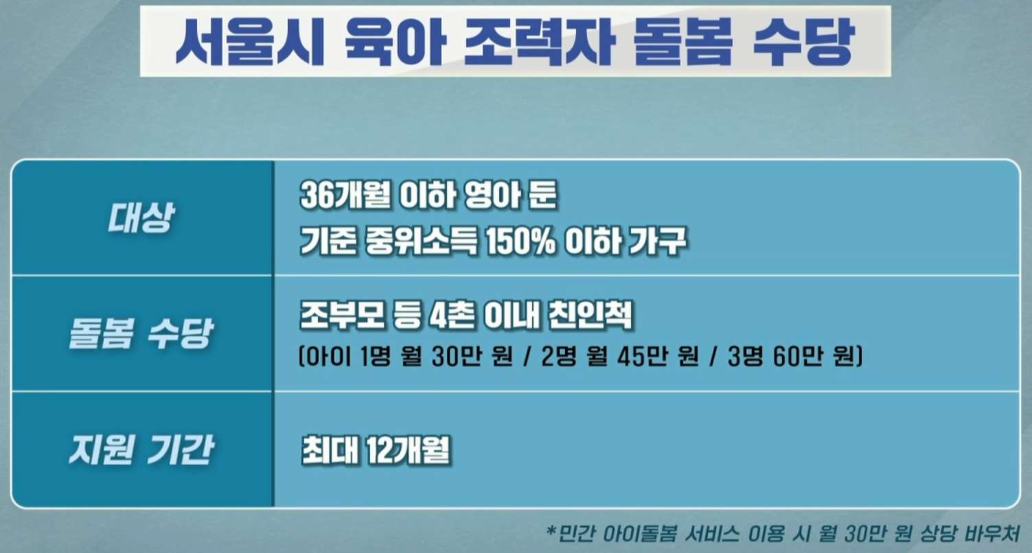 손주를 돌봐주는 조부모에게 월 30만 원을 지급한다고 합니다. 내년부터 서울시에서는 만 3살 이전의 아이를 조부모나 가까운 4촌 이내 친인척이 돌보는 경우에도 돌봄 수당을 지원한다고 발표했습니다. 36개월 이하 영아를 둔 가정을 대상으로 아이 1명당 월 30만 원의 수당을 최대 1년간 지급합니다.