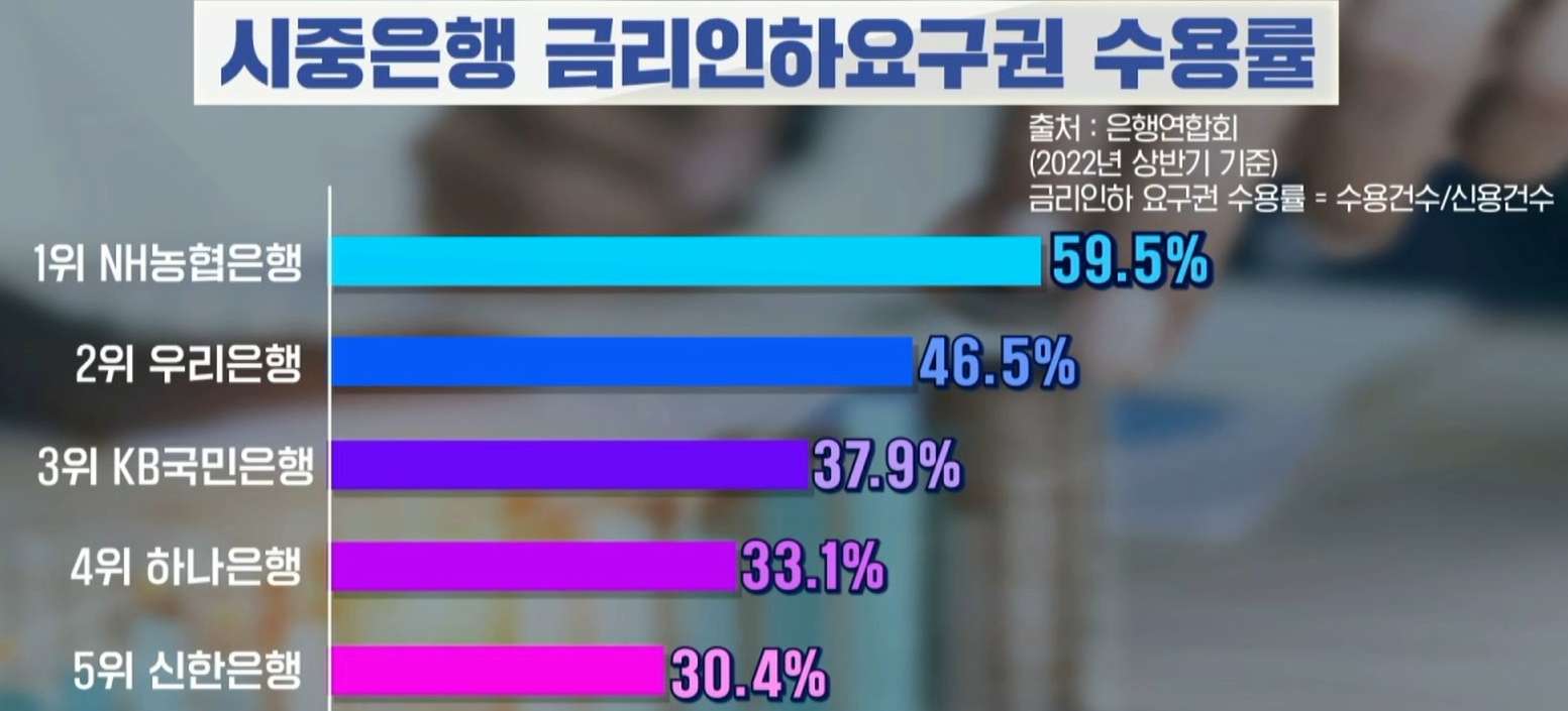 금리 인하 요구권 수용률을 공개했습니다. 은행들은 얼마나 깎아줬을까요? 금리인하요구권은 은행 대출자들이 승진을 하거나 연봉이 오를 때 신용상태가 개선된 경우 은행에 금리 인하를 요구할 수 있는 권리입니다. 하지만 은행들에서 잘 수용되지 않아 금리 인하 요구 수용 실적 공개를 하게 된 것이죠.