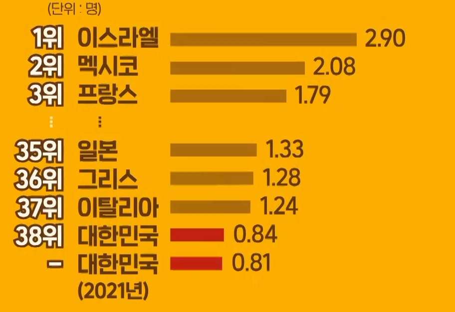 2020년 합계 출산율 순위를 보면 대한민국은 OECD 평균의 절반도 안 되는 수준이고요. 이렇게 0명대인 나라는 우리나라가 유일하죠.