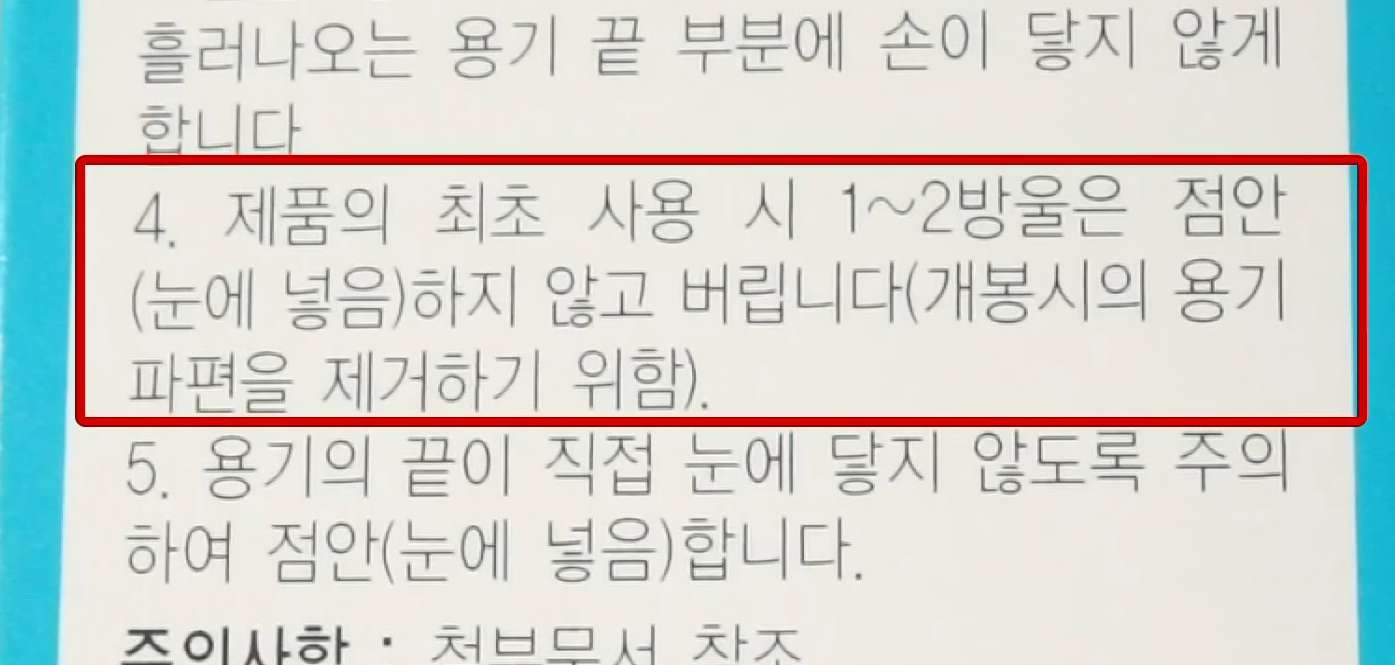 그러니까 제조 과정에서 위험성을 낮출 수도 있는 거네요. 그리고 우리가 지금 당장 할 수 있는 건 아래와 같은 문구를 보고 주의하는 것이 아닐까 싶은데요. 최초 사용시 한두방울은 버리라고 되어있는 인공눈물의 포장지 문구입니다.