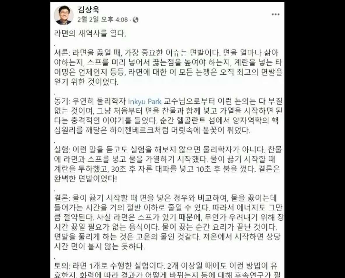 물리학자 김상욱, 라면을 찬물에 바로 넣어 끓이라고 글을 올려