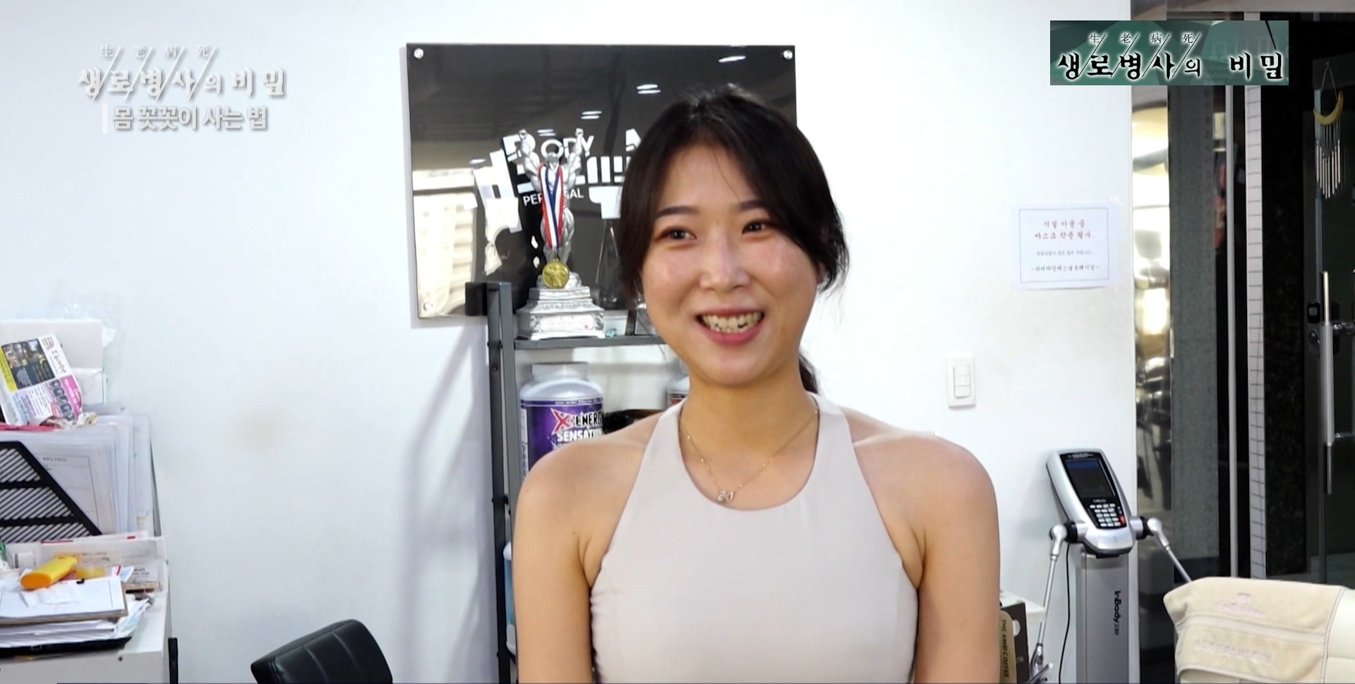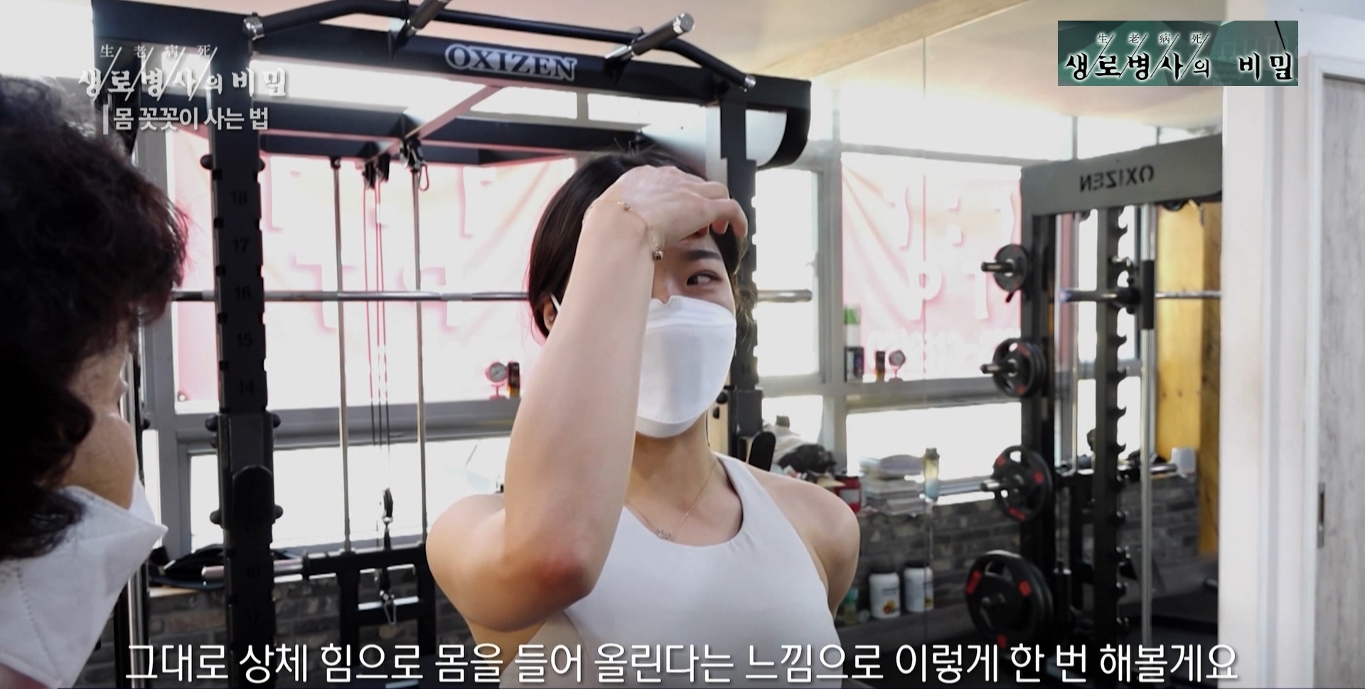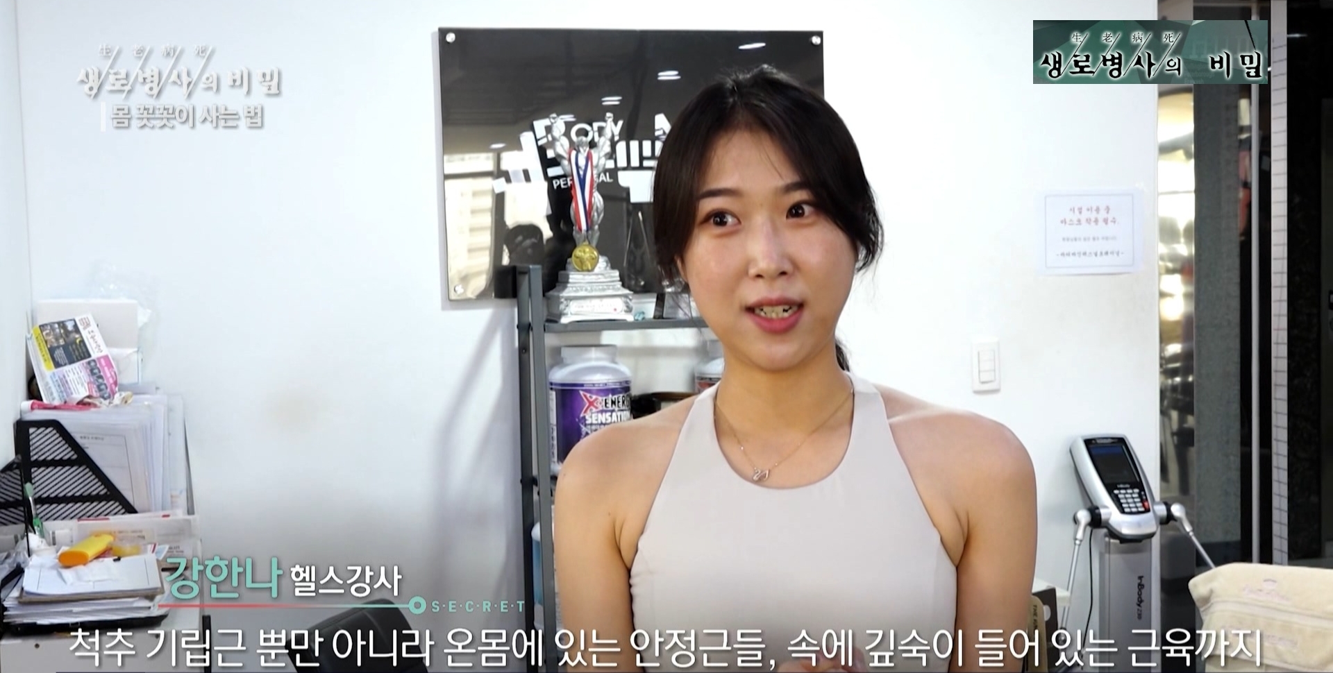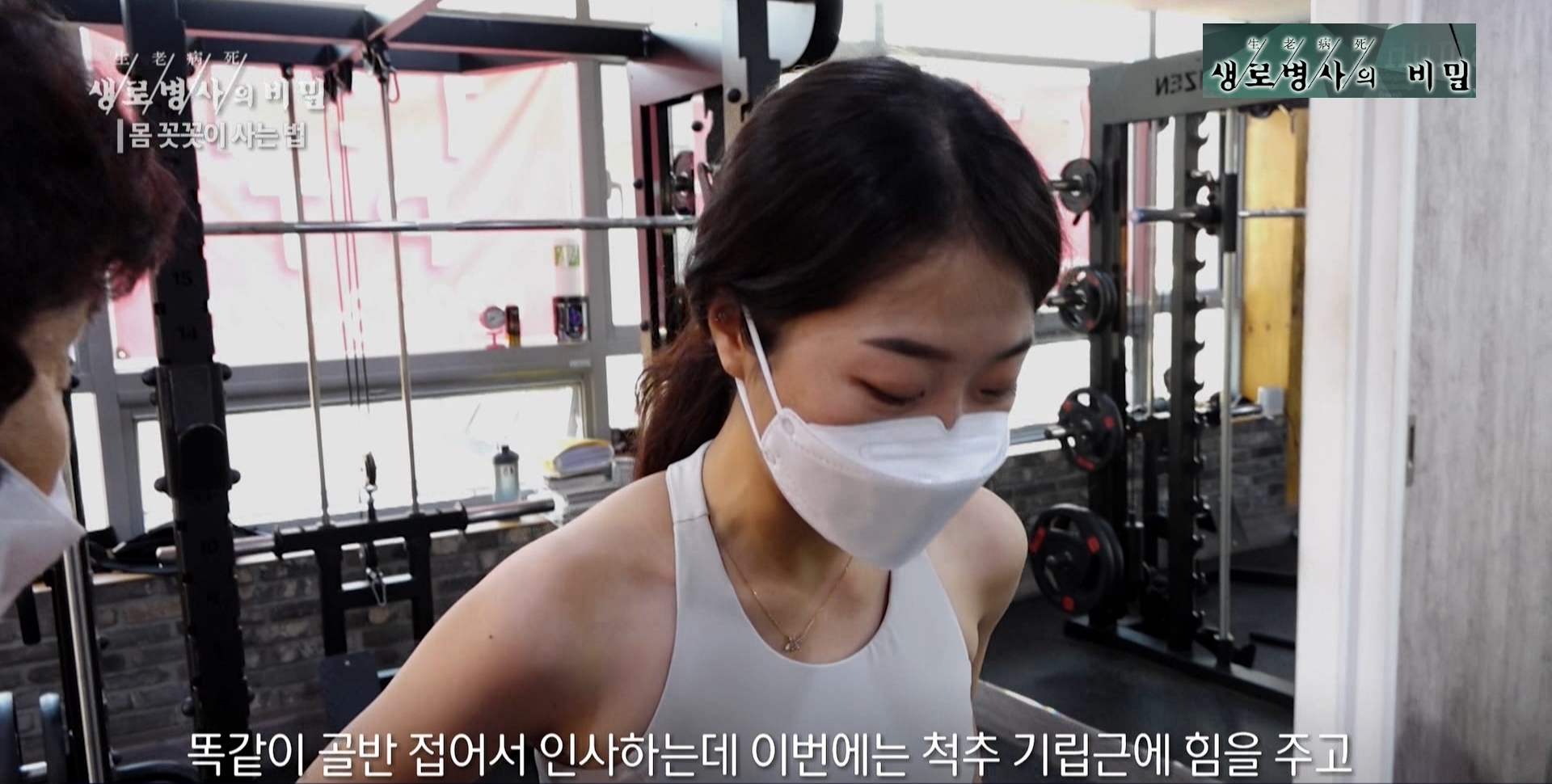 강한나 헬스강사 멘트: 척추 기립근 뿐만 아니라 온몸에 있는 안정근들, 속에 깊숙이 들어 있는 근육까지 다 사용하기 때문에 굉장히 척추 정렬에 도움이 많이 되는 운동입니다.