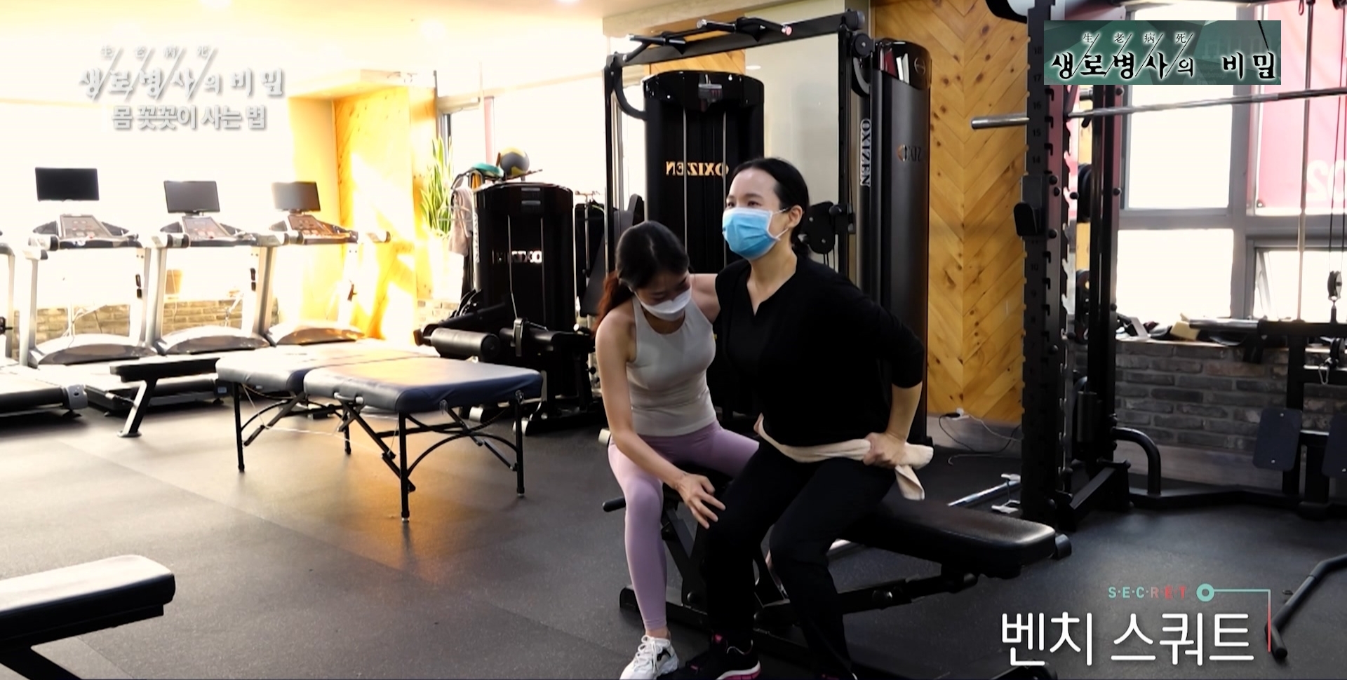 마지막 동작은 스쿼트. 역시 벤치를 이용해 의자에 앉는 자세로 마무리한다.