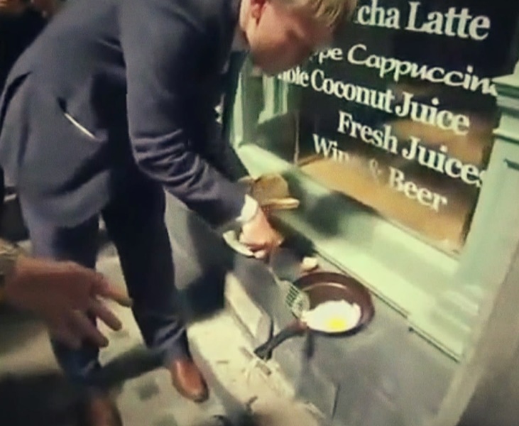 이곳은 영국의 월스트리트. 영국 런던의 시티 앤드 뱅크 거리인데요. 그런데 왜 길에서 계란 프라이를?