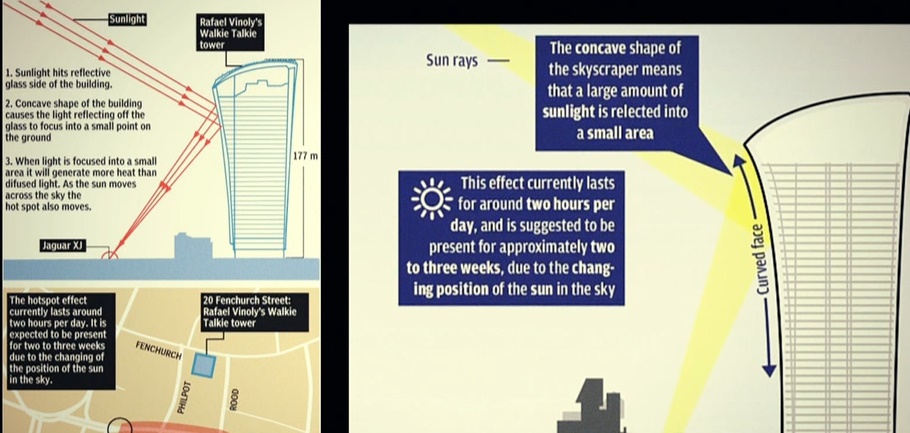 이렇게 매일 뜨거운 열을 거리로 반사시켰다는 워키토키 빌딩. 폭염이 극에 달했던 2013년에는 빌딩 앞 거리의 최대 온도가 무려 섭씨 91도까지 올라갔다는 사실. 빌딩 앞에 주차한 자동차의 차체가 녹아내리는가 하면, 잔디가 까맣게 타고 바닥 타일이 훼손되는 등 피해가 속출했으며.