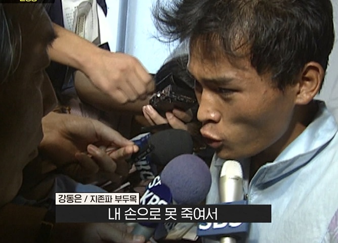 [강동은 지존파 부두목 : 압구정동 야타족들. 그랜저 몰고 다니면서 흙 튀기고. 그 X자식들 못 죽여서 지금 사회의 볼거리가 됐지만. 이걸 하나도 빠짐없이 좀 방송해 주십시오.]