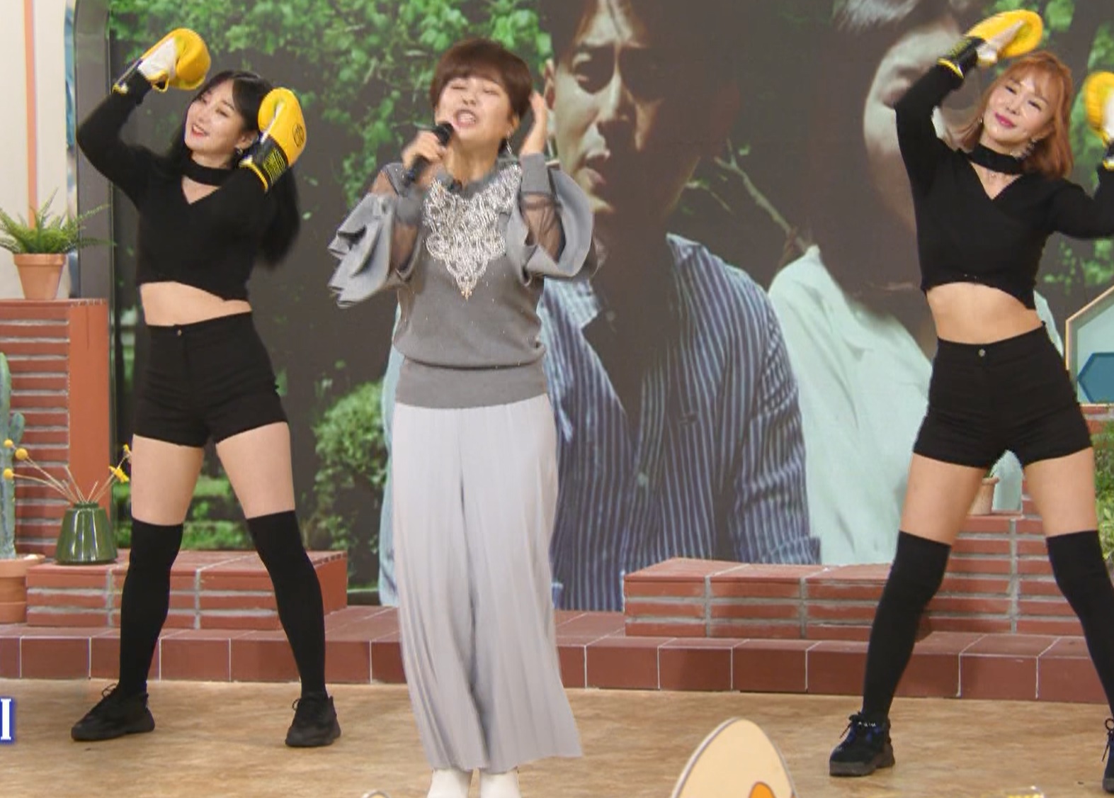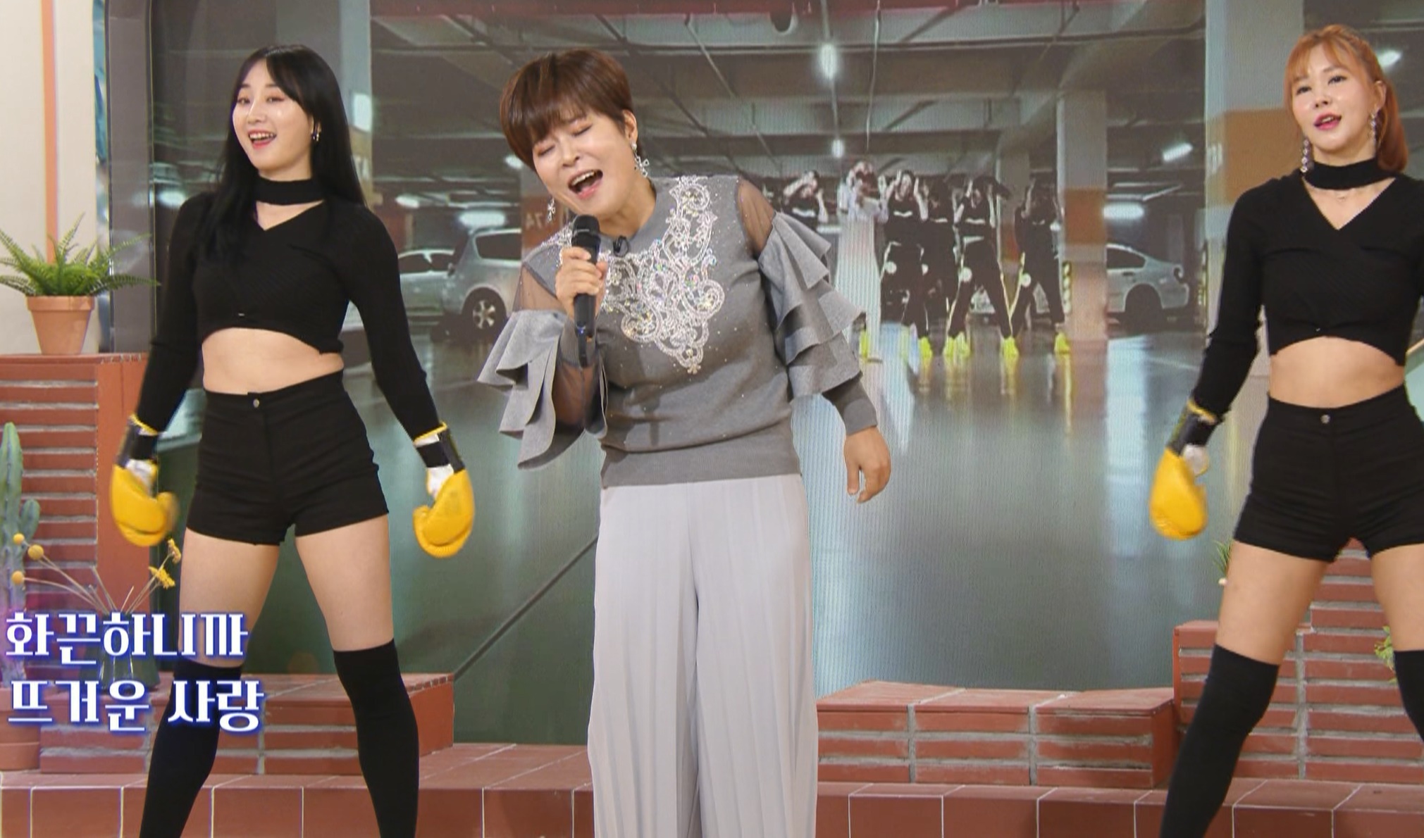 조혜련은 '아나까나'를 직접 작사를 했는데 이곡은 가사 저속의 이유로 KBS에서 방송 금지라고 하네요. 이번에 나온 '사랑의 펀치'라는 노래와 '아줌마줌바 '두 곡도 가사를 썼다고 하네요. 이 곡으로 열린음악회, 가요무대, 마지막에는 유희열의 스케치북, 뮤직뱅크까지 출연하고 싶다네요. 방송 끝에 예쁜 백댄서들과 함께 나와서 사랑의 펀치를 라이브로 불렀습니다.