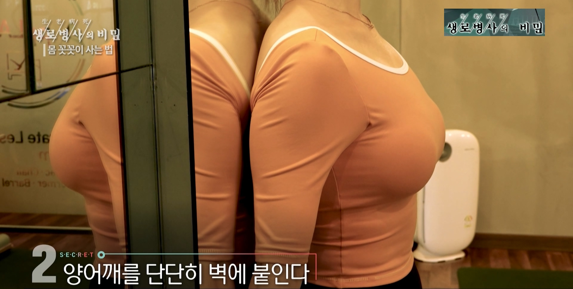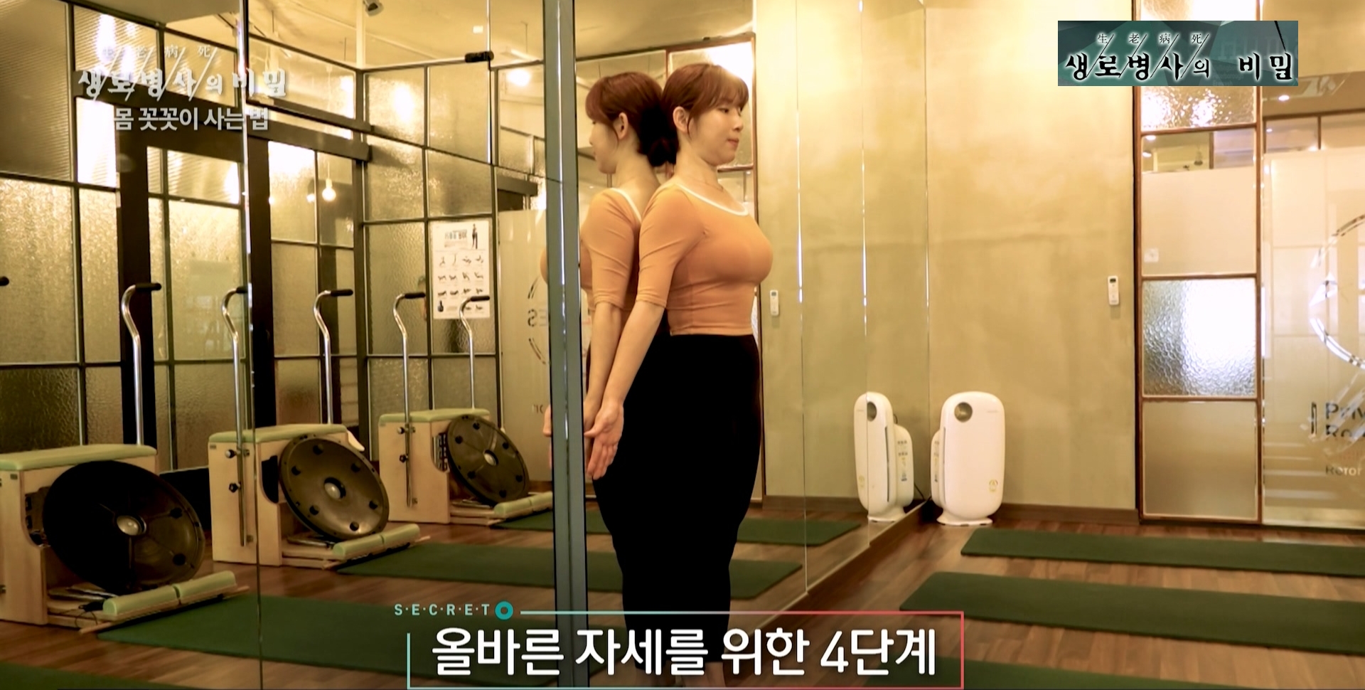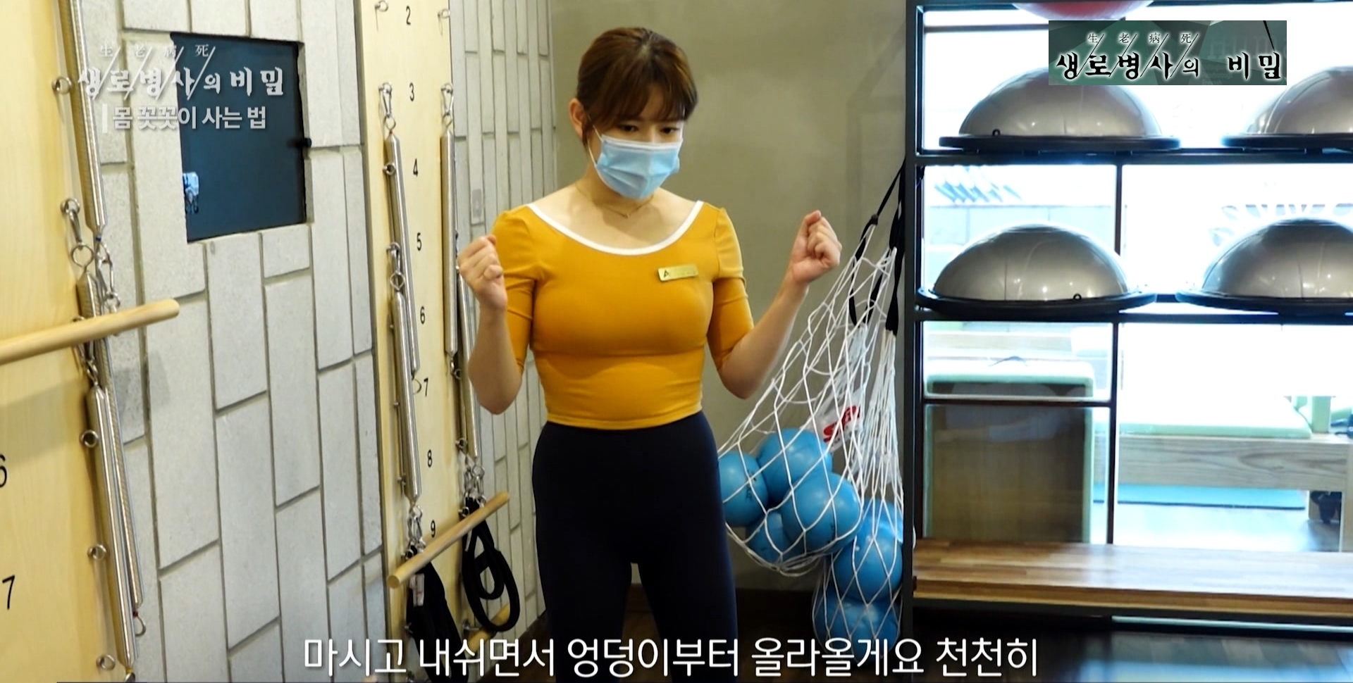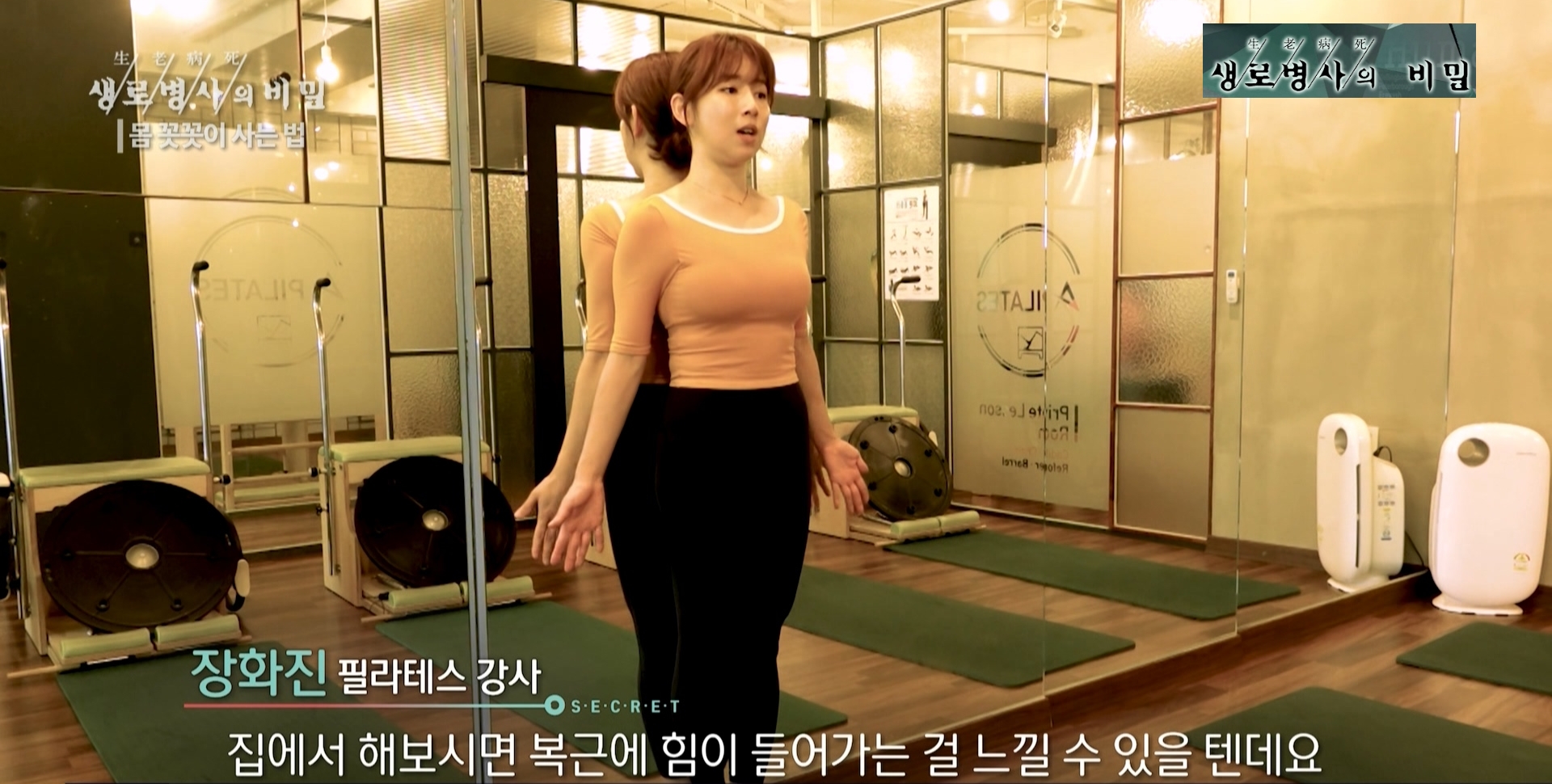 장화진 필라테스 강사 멘트: 집에서 해보시면 복근에 힘이 들어가는 걸 느낄 수 있을 텐데요 이것 자체가 우리가 바른 자세로 가고 있다는 증거예요