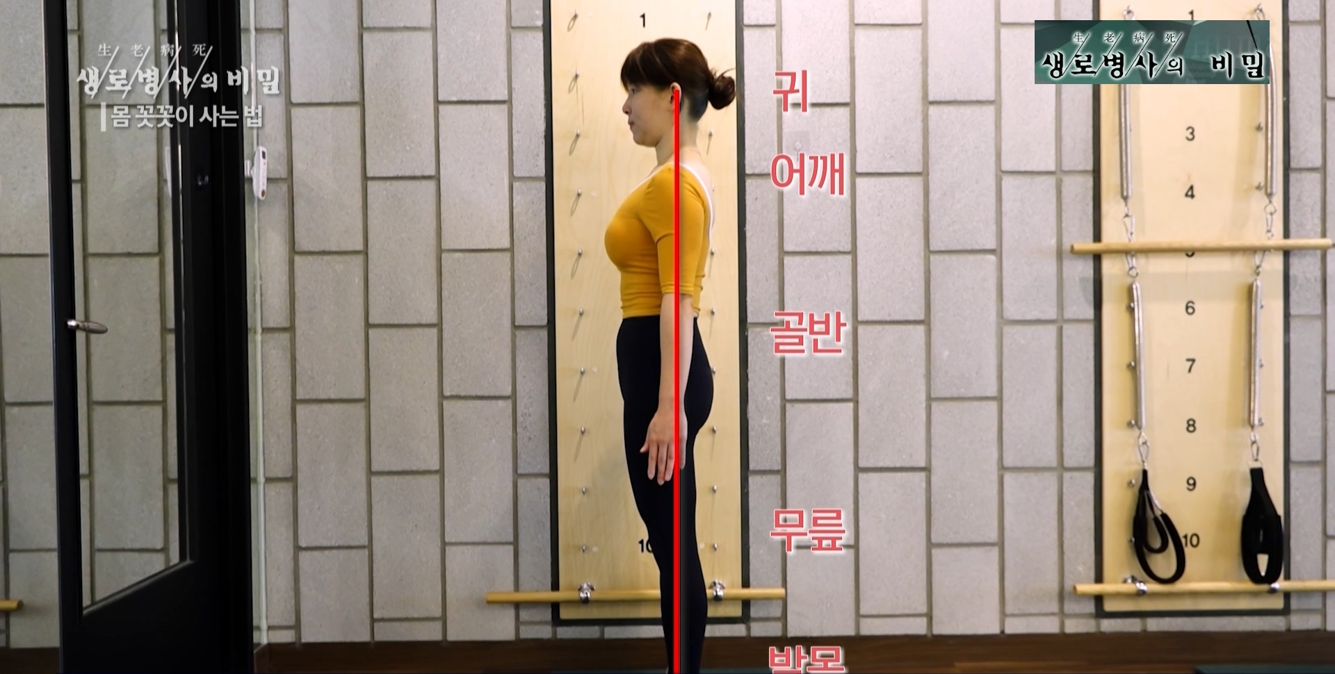 서 있을 경우에는 측면에서 볼 때 귀, 어깨, 골반, 무릎, 발목이 일직선이 되는 것이 바른 자세다.
