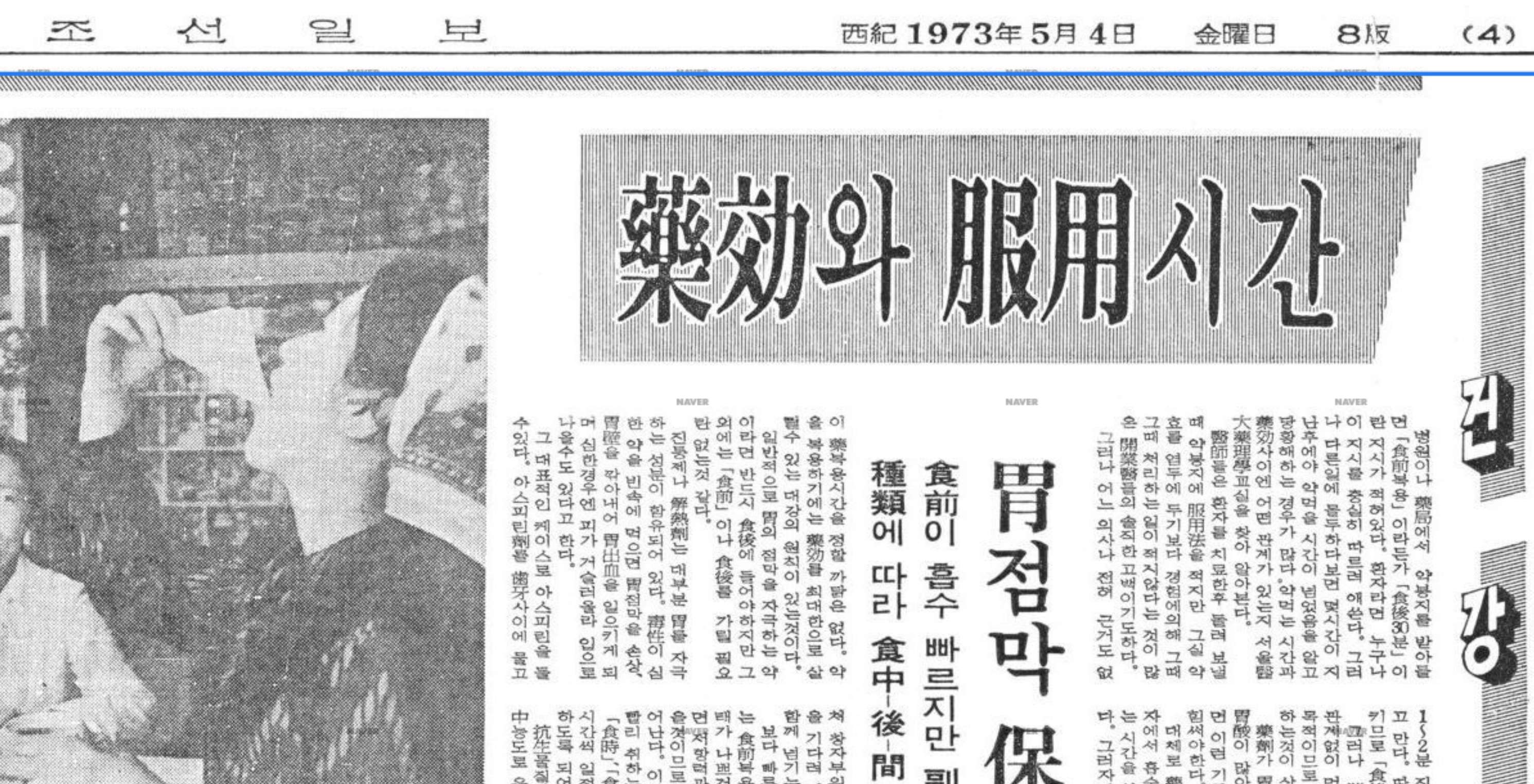 우리나라에서 1970년대에 한 신문 기사에 30분 후에 약을 먹으라는 기사가 실려 있었는데요. 바로 아래의 기사가 그 기사입니다. 이것은 음식을 먹고 나서 약 1시간 정도 지나면 음식이 장으로 넘어가기 때문에 그와 타이밍을 맞춰서 약을 식후 30분에 먹으면 위점막을 보호해서 위장 장애를 최소화할 것이라는 추측에 의해서 이런 신문 기사가 실렸을 거라고 합니다.