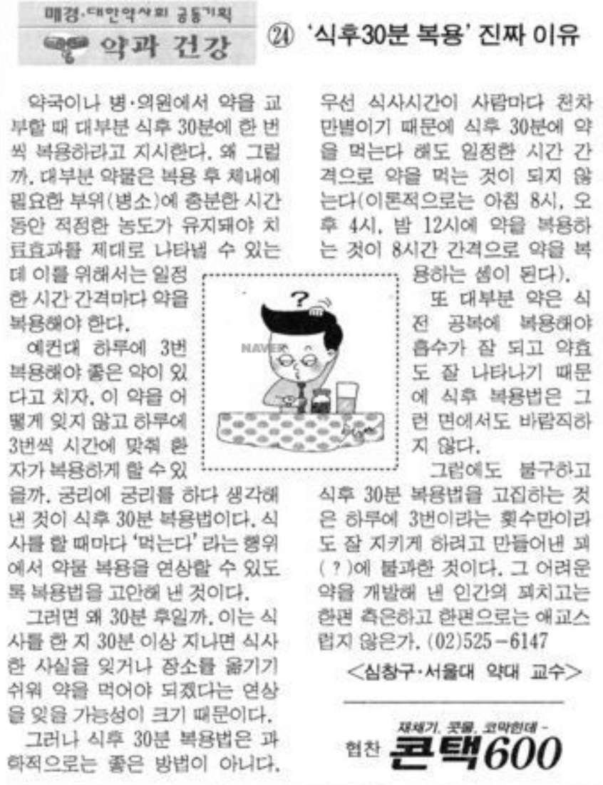 하지만 30분 뒤에 약을 복용하면 실제로 위점막이 보호된다는 과학적 근거는 없다고 합니다. 그런데도 왜 30분 뒤에 먹어야 한다고 계속 그랬던 걸까요? 그 이유를 설명하고 있는 90년대 칼럼을 발견했습니다. 바로 아래의 신문 칼럼인데요. 아래 칼럼의 내용을 요약하면 '잊어버리지 않고 약을 복용하도록 하기 위해서 식후에 먹으라고 꾀를 짜냈다는 것'이라고 하네요.